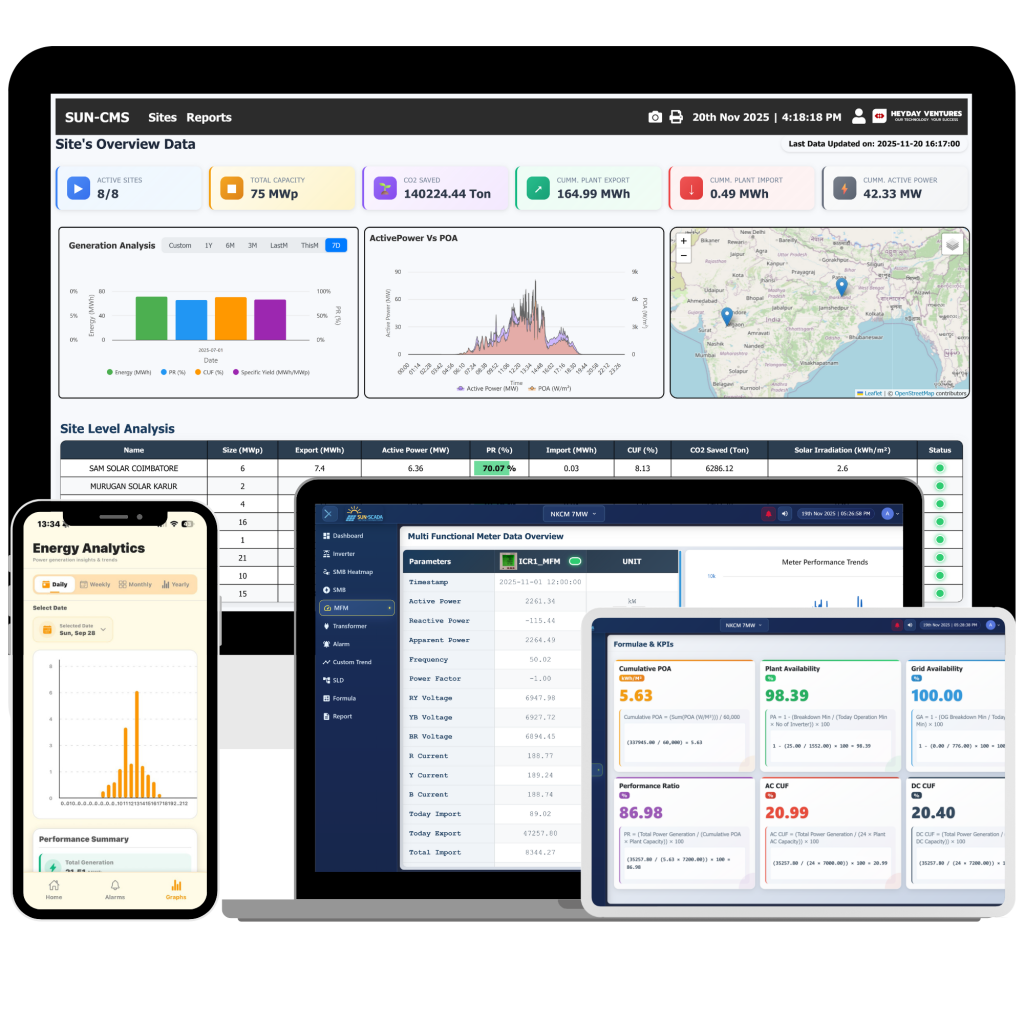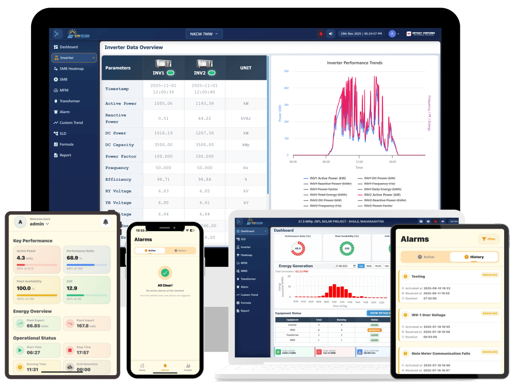 • Live Equipment Monitoring – Real-time tracking of inverters, MFMs, WMS and Transformers.